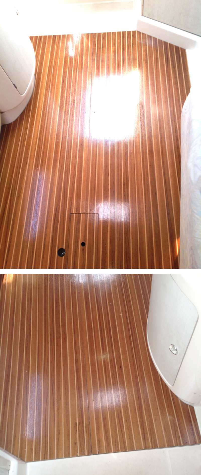 | 2014年3月10日 Y31Sの床板再生。 ヤマハ31Sの床板が、かなりボロボロでひどい状態なので、納艇前に再生することに・・・ 俗にツキ板と呼ばれる合板で、ストライプのチーク部分は0.5mm程度で紙のように薄く、 これでは数年でダメになってしまうのも当然〜 コストダウンと軽量化のためと仕方ないことかも・・・ 作業はその薄いチークを剥がすことから始まる。 ノミ、スクレッパーで剥がしにかかるが、これまたなかなか根気のいる作業で1×2mの板で約1時間、 さらにサンディングで表面を整える。 この作業を怠ると、新しいツキ板を貼ると表面がデコボコに仕上げってしまうので・・・。 今回はここまでで、次回はさらに細かいサンドペーパーで仕上げ、ツキ板を貼付けていきます〜 次回、張り付けるのは3mmのツキ板。 特注で製作してもらいました。 |