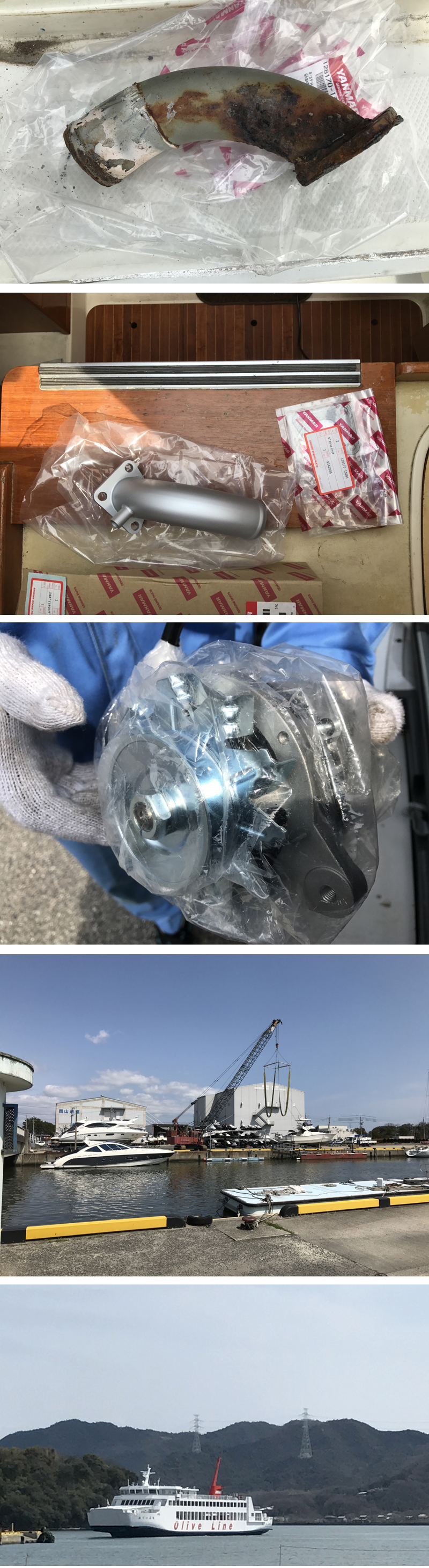 そうそう、忘れてました・・・ 3月20日に牛窓YHを出航した鹿児島行きのCC32は、1週間で何のトラブルもなく到着の知らせが入っていました。 それと泉佐野から出航したX342からは明石海峡通過の連絡があったきり連絡がありません。 海上保安庁、税関から連絡がないところを見ると、今頃は対馬で通関している頃でしょうか??? さて、4月に入りました。 昨日、1日は牛窓YHに納艇させて頂いたYAMAHA30C2のミキシングエルボーにクラックが見つかっていたので、パーツ暢達が出来たので、Sメカさん同行で交換に。午前9時集合! 雑談も交えながら、約2時間弱で終え、Sメカはひと足先に網干BPに移動。 チャージランプのトラブルを解消のためオルタネーターを交換に向ってもらい、ワタシは岡山新築港にある岡山ドックさんに検船に・・・ そのあと、網干BPに移動、チャージランプのトラブルはオルタネーターを交換することで無事解決しました! オーナーさんには随分と長い間お待たせしました(>_<)感謝です〜 そして更に更に、夜間航行で西宮マリーナにあったFeelingを移動。 もちろん安全を期して夜間に関わらず、Uクンを呼びつけました。 4月7日、8日、9日と新西宮YHで「関西ボートショー」が開催されます。 画像 クラックが入り海水が漏れたミキシングエルボー。 新しいミキシングエルボーに交換(YAMAHA30C2) 新しいオルタネーター。アッセンブリ交換。 岡山ドックの全景。 新築港から出航するフェリー。 |