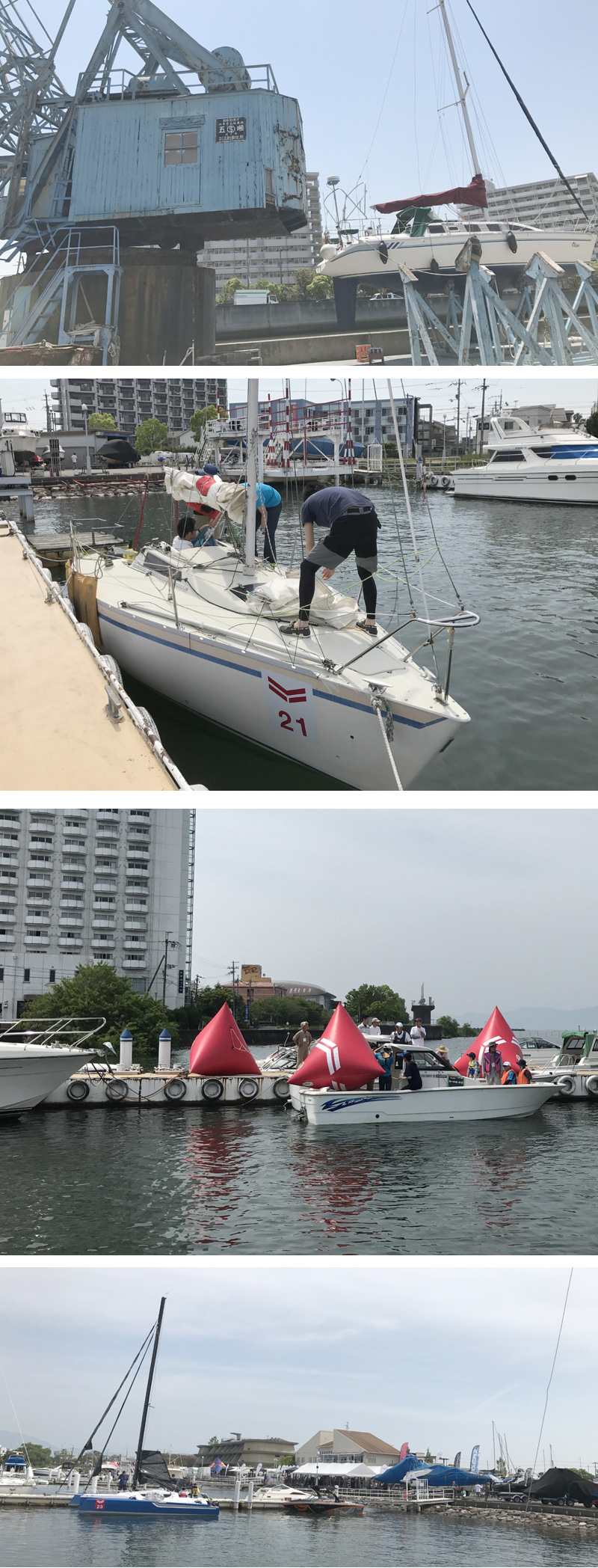 琵琶湖艇を運び出しました。 艇は35フィート。 クレーンをチャーターし、大型トレーラーに乗せ2日をかけて九州・福岡まで陸送。 スタッフ一同午前9侍に琵琶湖は大津港マリーナに集合し、まずは上架。 琵琶湖といえ汚れた船底を高圧洗浄し、そこからマスト倒しの準備に掛かります。 艇が35フィートもあるため、トレーラー輸送のため気を使ってパルピット、スタンション、ドジャー、ビミニ、更にはステアリングも取外し、ブームとジブファーラーもバラバラに。 旧船名と船籍港のステッカーを剥がし、最後にマストを吊り上げ、一旦地面に降ろし、船体本体を吊り上げトレーラーに・・・ ここまで掛かった時間はランチタイムを挟んで3名の作業で6時間。 積込みとラッシングに結局2時間を要しました。 しかししかし、本当に琵琶湖の船には蜘蛛が至る所に巣を作っています。 到着したらまずは蜘蛛の巣取りからはじめないと・・・。 琵琶湖、大津港マリーナにて。35フィートの陸送準備中。 |