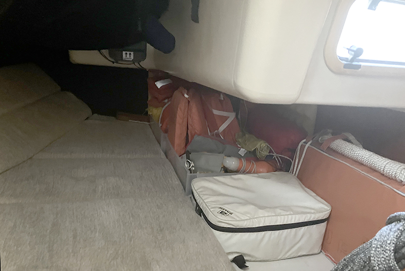 | 上記画像はエンジン後部の壁面の有効活用。 手前は一番使用頻度の高いジェネカーシート。 奥にはほとんど使用することがない舫ロープ。 細かい雑索ロープ類はケースに収納。 YAMAHA30CRS |