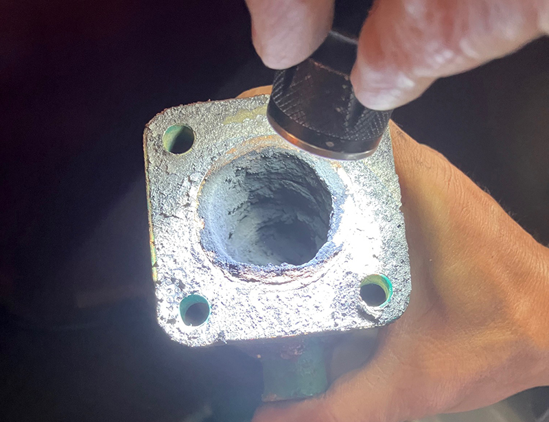 | VOLVO MD2030のミキシングエルボー。 先日のキングストンと同じで目詰まりが起こります。 エンジンに不調が起こると要注意。 |