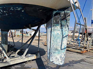 | 8月21日に上架。 船底整備(塗装)とハル磨きと船名の貼付と経年劣化したフォールディングペラの取替作業。 ペラは事前にNJYにオーダー。 作業は西宮で活躍するBWさんに一任した。 ペラ、シャフトを抜く作業に取り掛かると、ラダーが固着して抜けない! 作業は難航したが、なんとかシャフトとペラを抜いてもらい、加工をBOAT LIFEさんを通じて高澤製作所さんに持ち込んだ。 しかし、いつもなら高澤製作所にしてみれば、簡単な工程なのですが、新しく輸入されたGORIのペラは旧モデルとは仕様が少し異なり、一旦ペラを分解しデーター計測が必要となったとの事で、少し時間が必要となった。 使用船底塗料はSeaJet033 Premium Black |