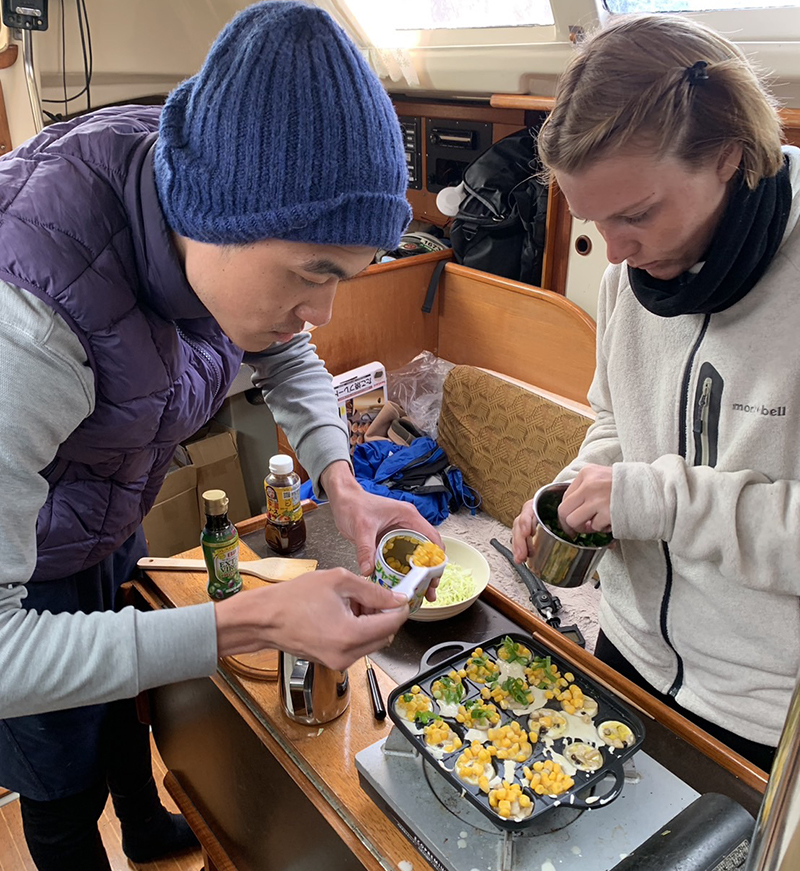 幸にして、船底の状態が良く、余裕を見せたTAIWANチームはキャビンでタコ焼きランチをする33才と27才。