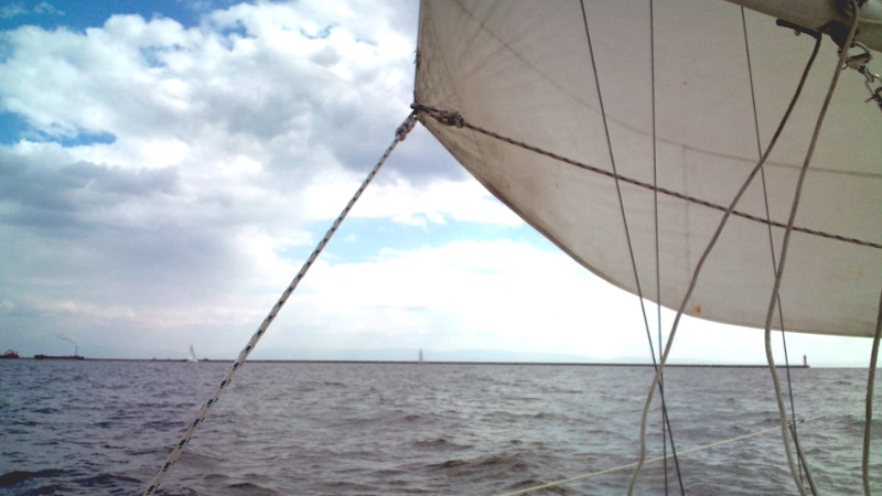 少し強めの北からと北西の風、セールは夜のため視界確保のためメインセールのみ。ブローは時折20ノットを越え、波も瀬戸内にしては高く、艇は前後左右に揺れつづける。